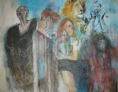 This is done in watercolour pencil crayons and it is only moderately huge - 2x4 feet or so. I like using these pencils, but the end result is so smooth compared to oil pastels, or even paint. I also used some soft pastels and gouache - can there be anything better than gouache? I liked the way that this hand here worked out.